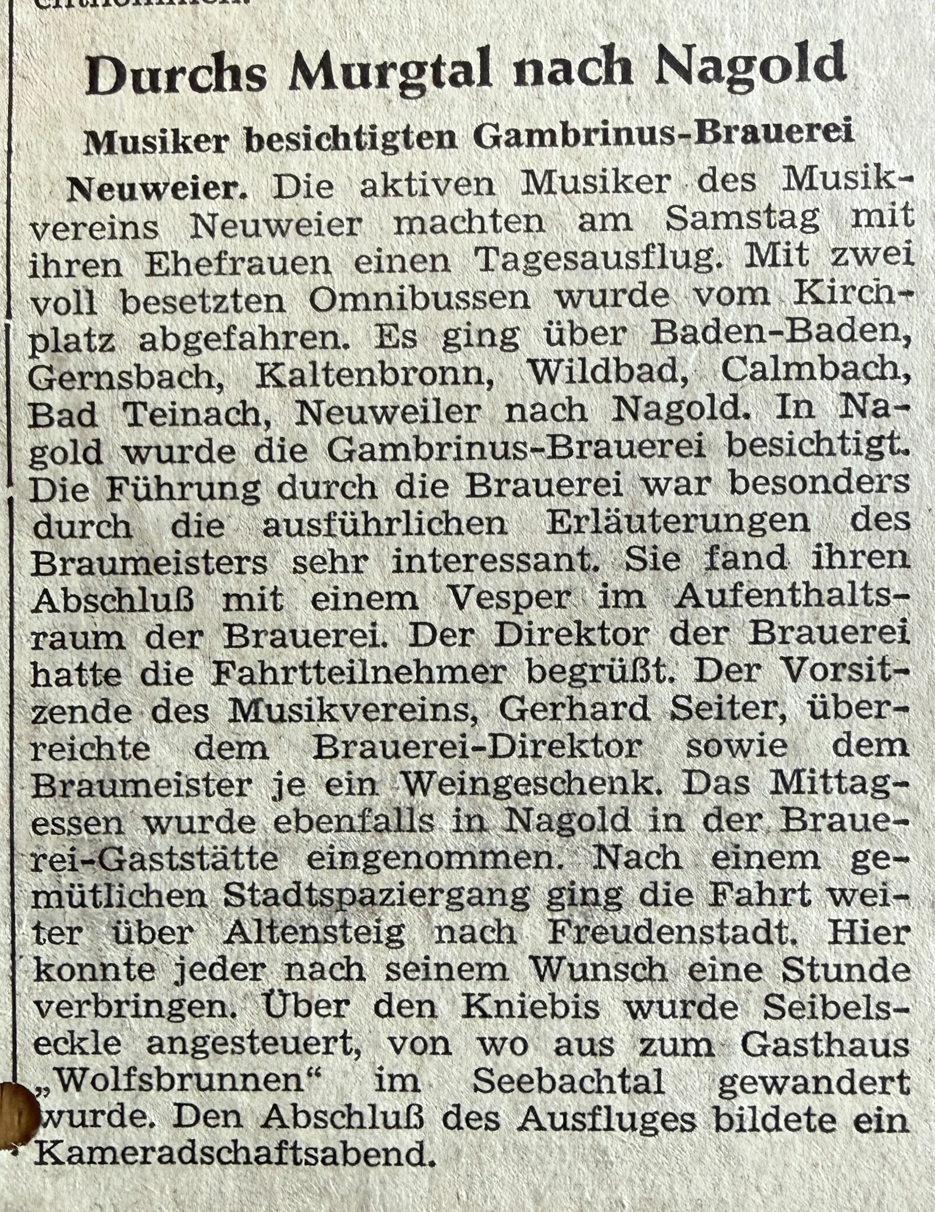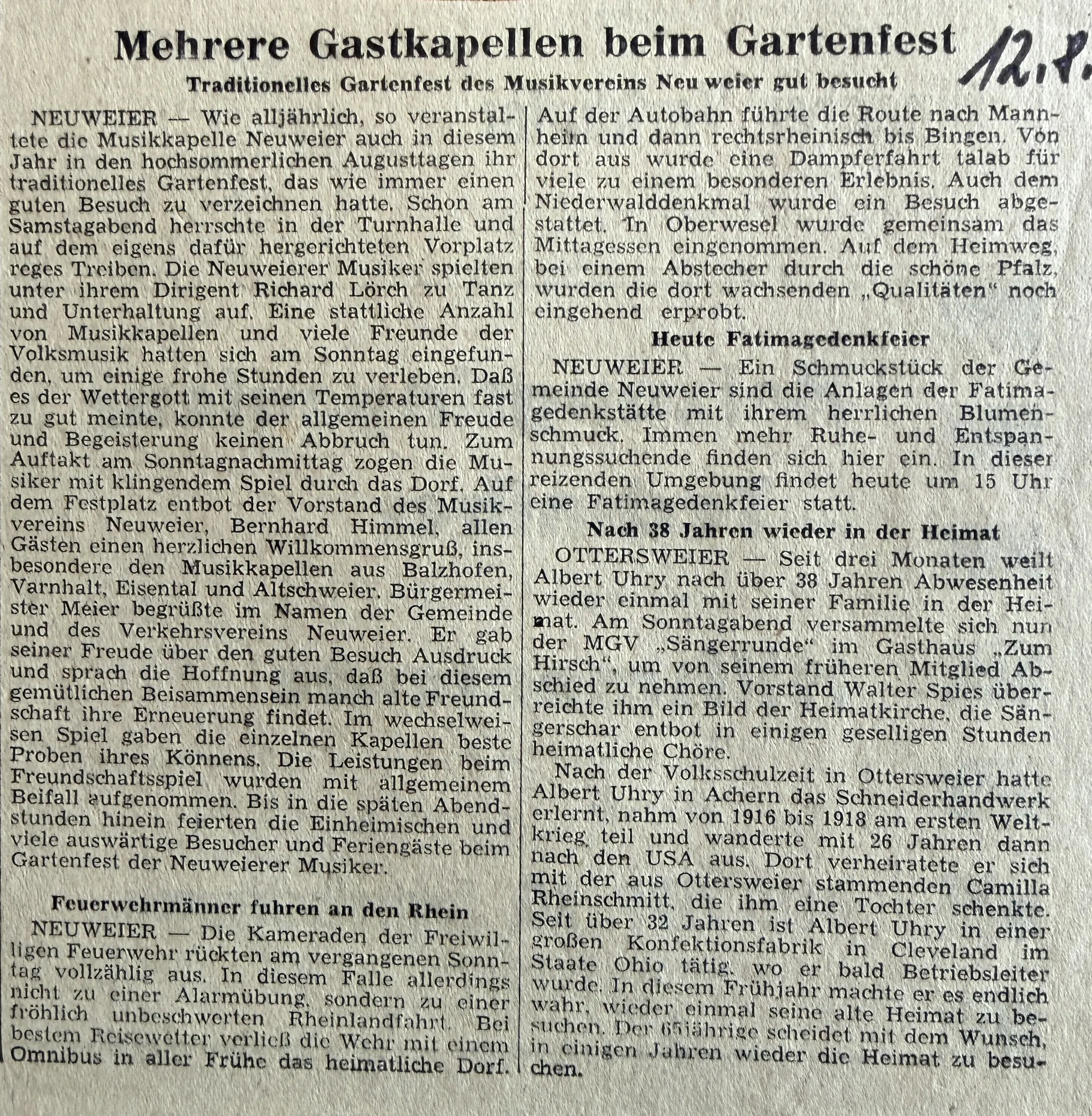 Von jeher brachten die Veranstaltungen der hiesigen Musique "Harmonie" zahlreiche Freunde und Musikanhänger auf die Beine. Diejenigen vom letzten Sonntag hat alle bisherigen weit übertroffen. Der Grund hierfür durfte wohl die Verpflichtung des Musikvereins Neuweier (Baden) sein, der hier auf die angenehmste Art überraschte.